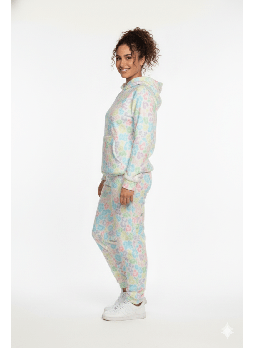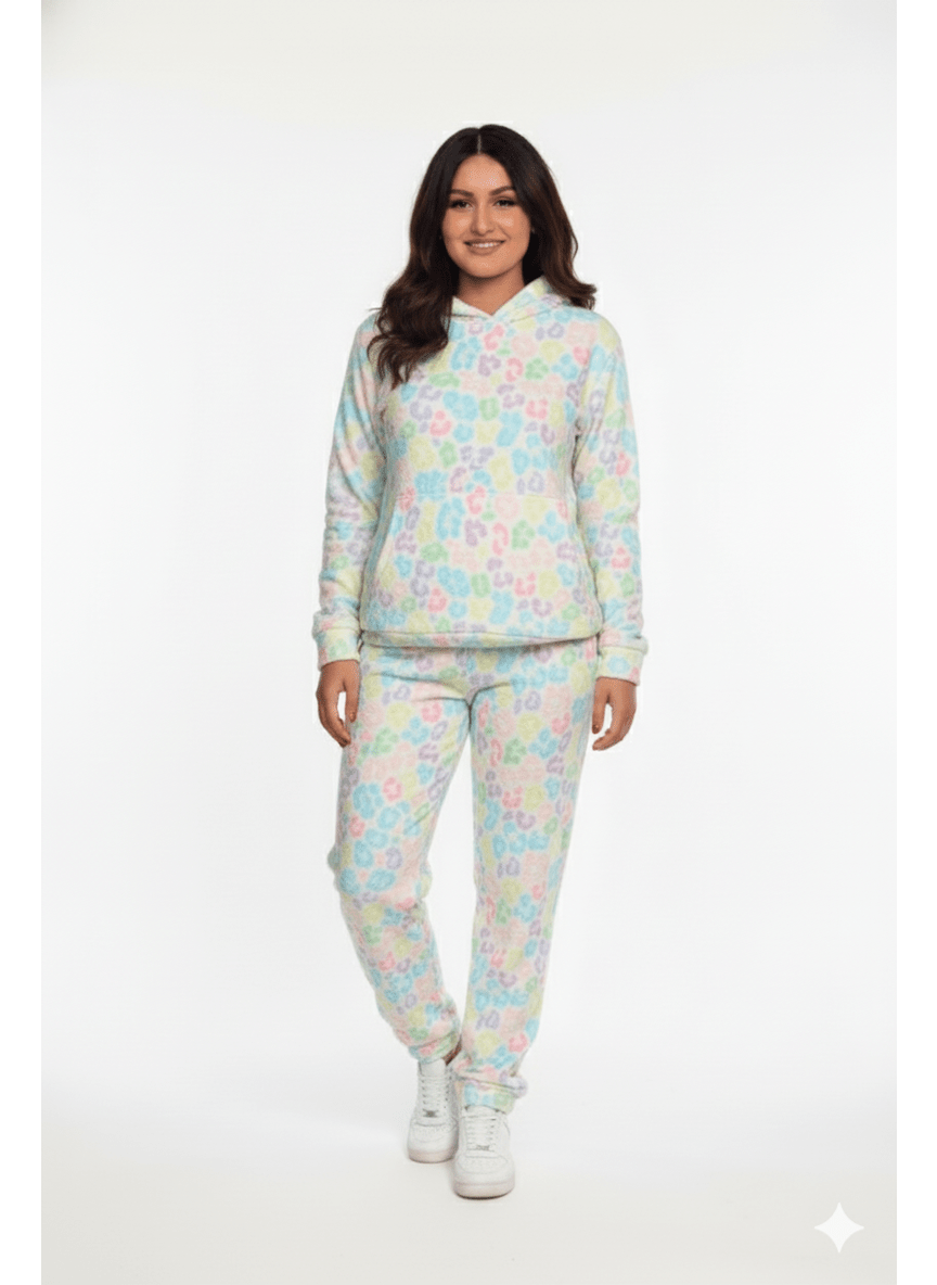 The entire set features a fun, abstract leopard-style print splashed in cheerful, muted pastels—think soft yellows, pale pinks, mint greens, and baby blues—all set against a creamy white base. The top is a relaxed pullover hoodie with a spacious kangaroo pocket, and the matching joggers feature an elastic waist for a perfect, easy fit. It's the perfect way to bring happy colors and supreme comfort to your lazy days.