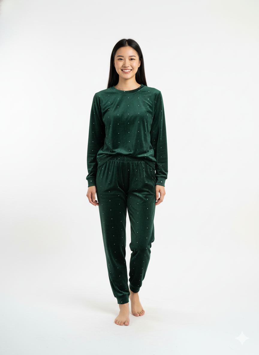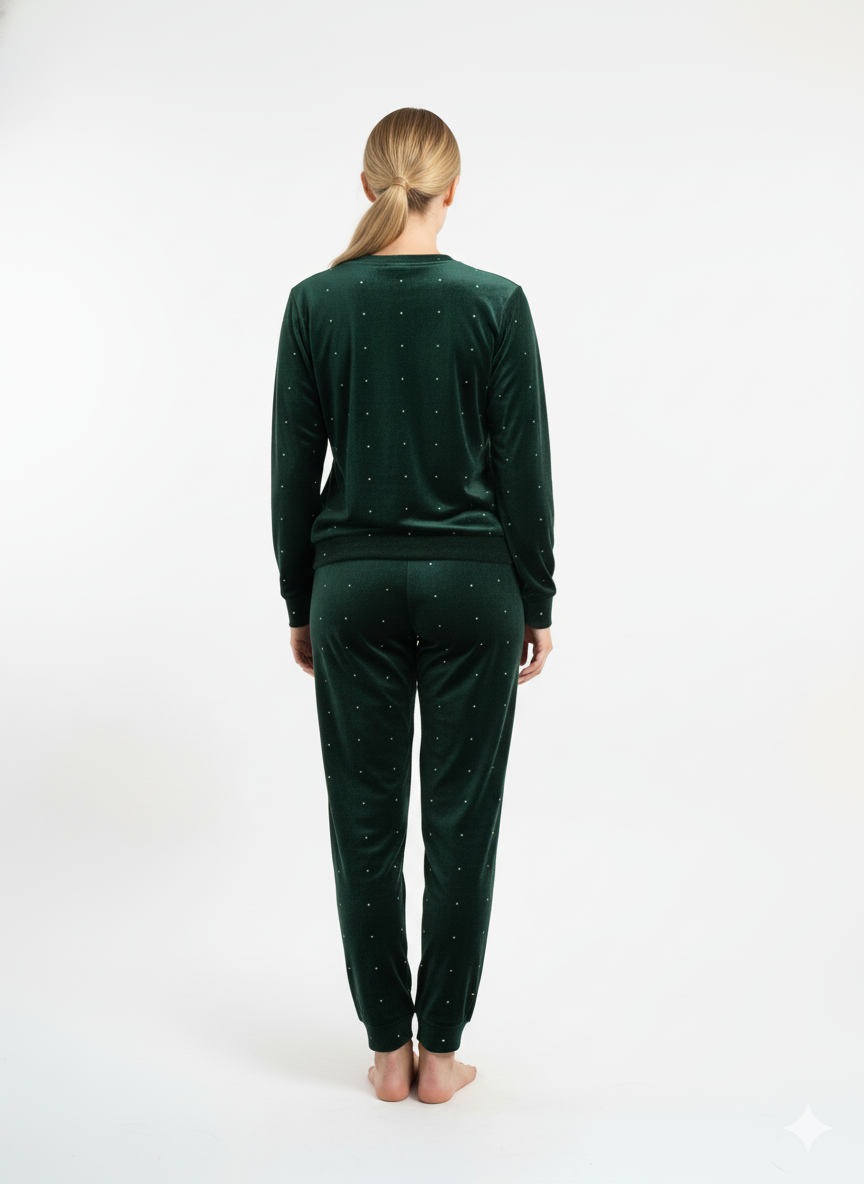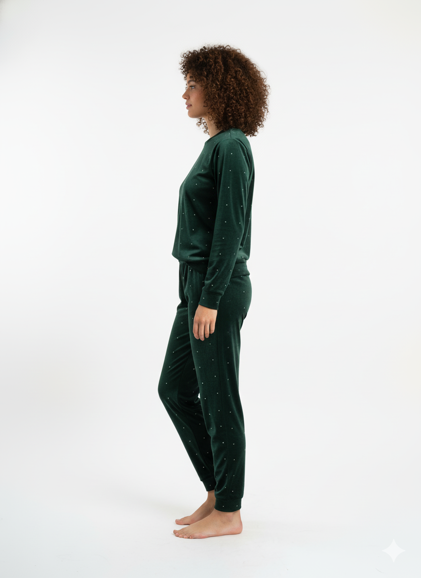 Crafted from a plush, velvety soft fabric, this set drapes beautifully and feels silky smooth against your skin. The deep emerald green hue is sprinkled with a delicate, all-over pattern of tiny white polka dots that resemble a starry night sky. The top is a relaxed, elegant crewneck pullover, and the matching trousers are a comfortable jogger style featuring a clean elasticized waistband and functional side pockets. This set is pure luxury, perfect for cozy evenings or hosting guests in style.