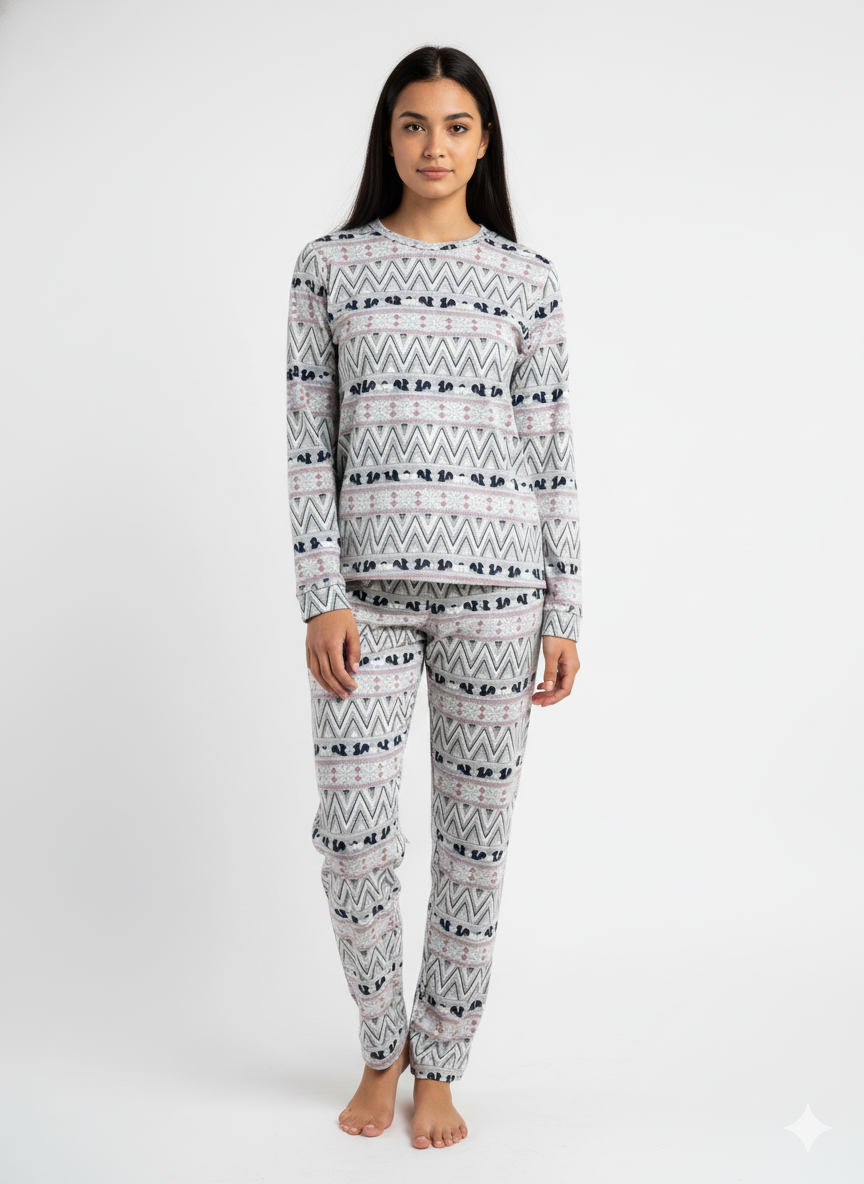 Bring cozy winter charm to your nights with our Nordic Squirrel Set — a warm and playful pajama featuring a soft knit-feel fabric and adorable squirrel patterns inspired by Nordic winter motifs. The gentle grey base, zigzag design, and subtle red accents make it both cute and stylish for chilly evenings.