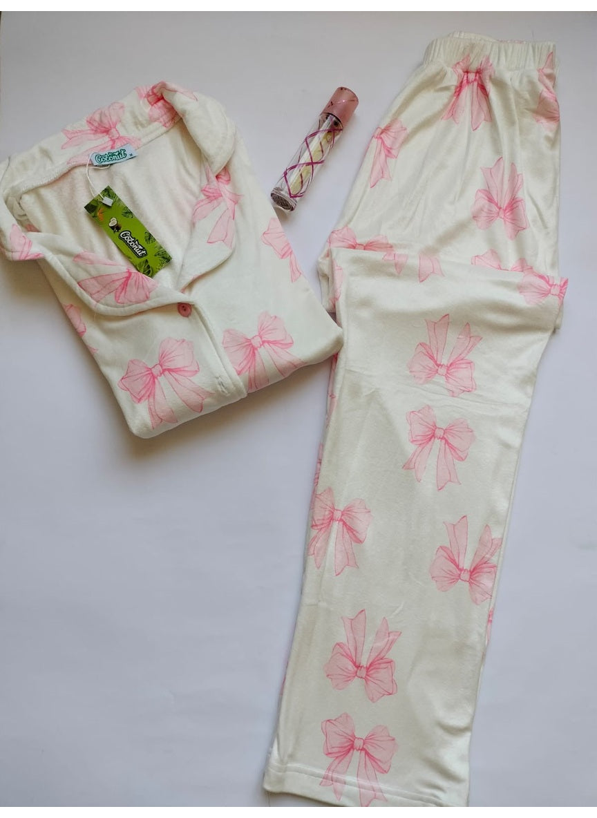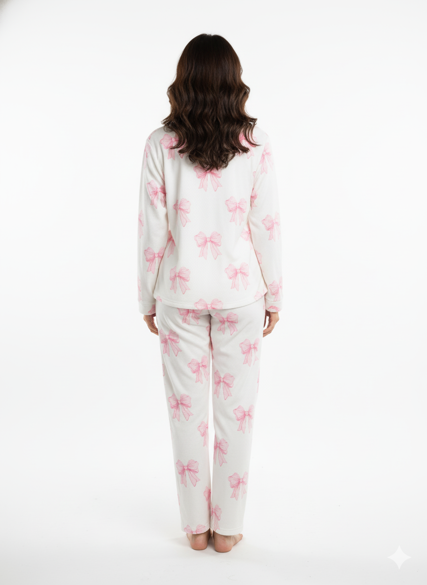 Sweet, feminine, and irresistibly soft — the Pink Bow Charm Set brings elegance to your cozy moments. Featuring delicate pink bows printed on a creamy white base, this pajama combines a girly aesthetic with ultra-soft fabric that feels like a gentle hug.