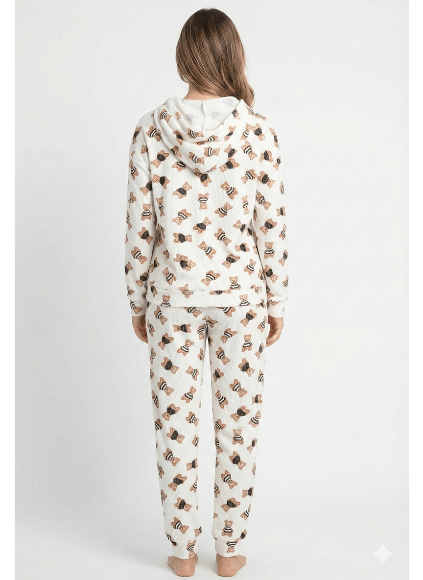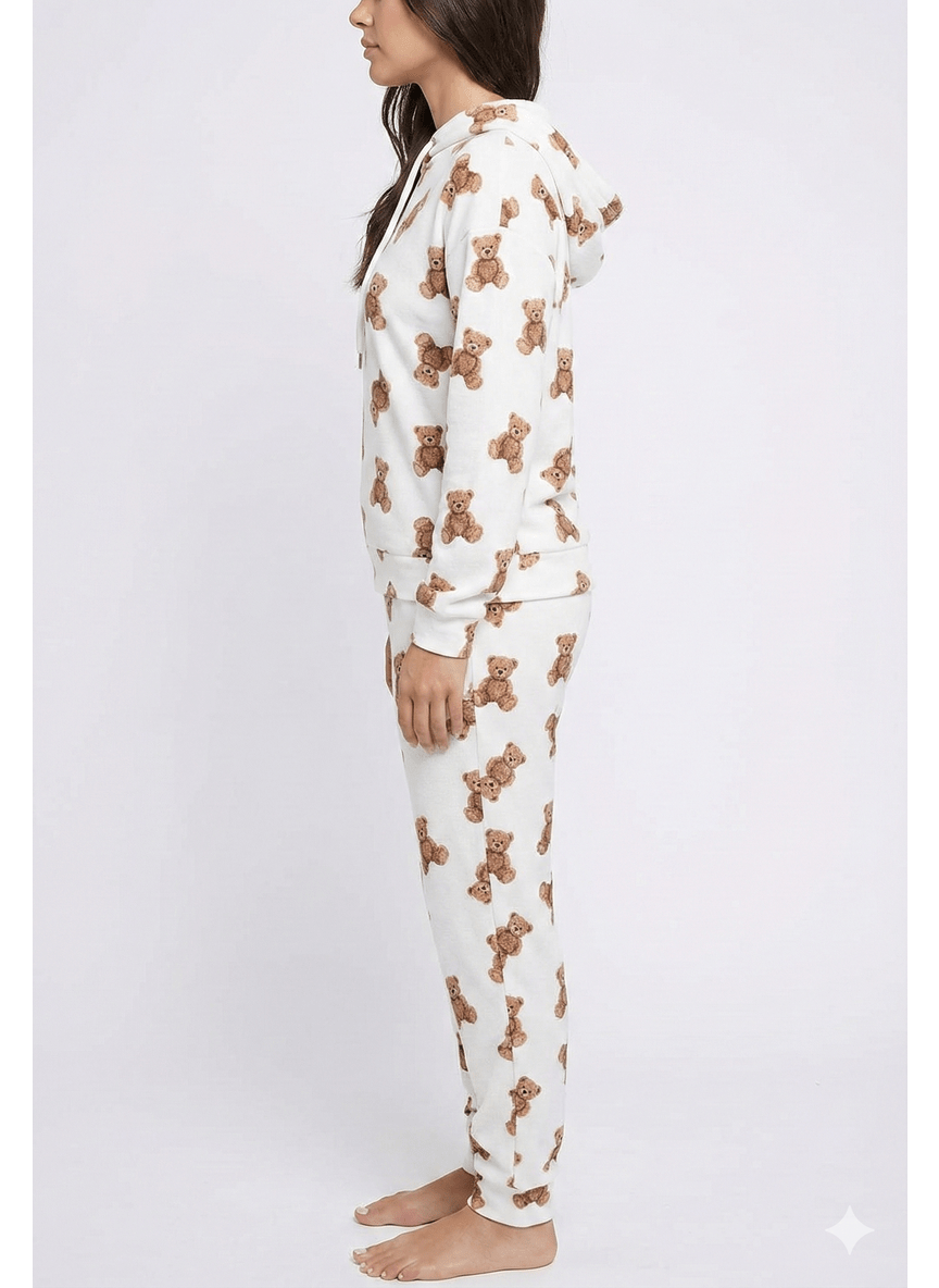 Add a touch of playful charm to your sleepwear collection with the Cuddly Teddy Bear Lounge Set. Made from a soft, textured knit fabric, this set features an adorable all-over print of teddy bears wearing striped sweaters. The pullover hoodie provides a casual, laid-back look, while the matching joggers ensure a snug fit with comfortable ankle cuffs. It’s sweet, stylish, and perfect for relaxing.